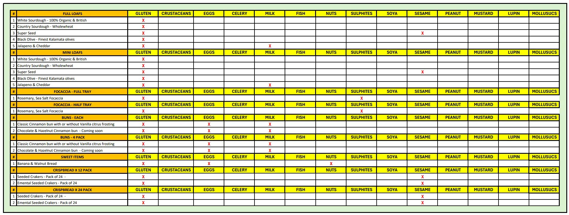 We understand the importance of clear dietary information. On this page, you’ll find a comprehensive guide indicating the presence of common allergens like gluten, milk, eggs, nuts, sesame, sulphites, soya, crustaceans, celery, fish, lupin, mustard, and molluscs in our breads, focaccias, and buns. Whether you’re seeking gluten-free bread options (if applicable to future products, currently none are listed as gluten-free), dairy-free buns, or simply want to know what’s in your favourite treat, our easy-to-read tables ensure you have all the facts.